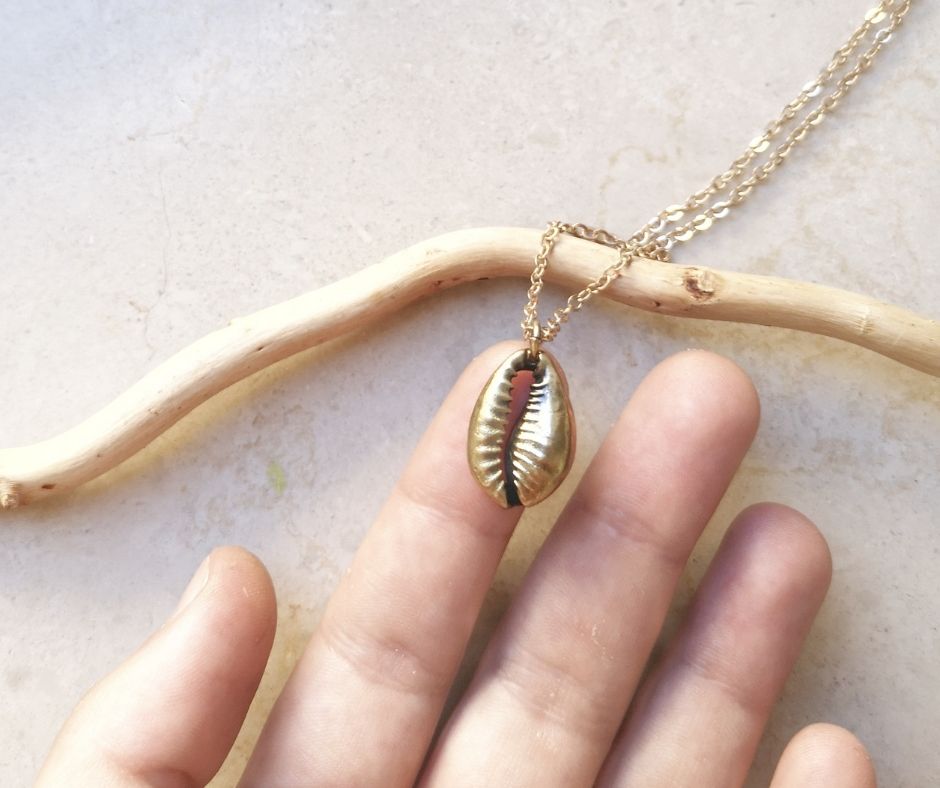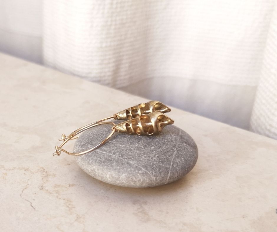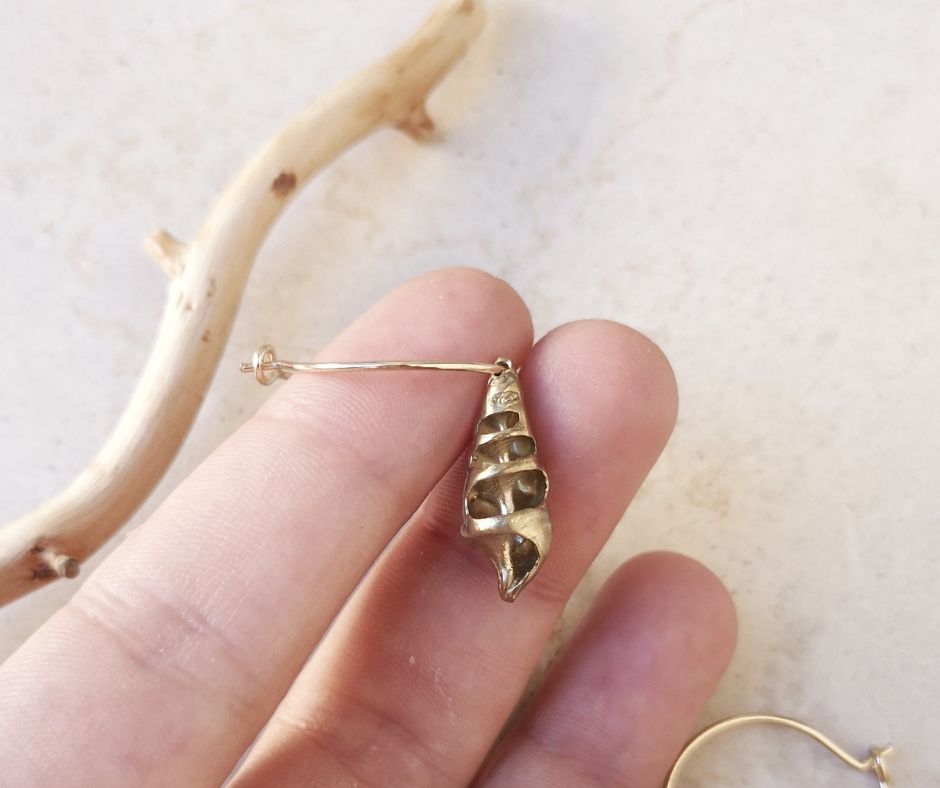 La mini collezione comprende anche un paio di orecchini a cerchio completamente in ottone decorati con due piccole conchiglie che ho personalmente raccolto sulla spiaggia del paesino dove abito. E’ un abitudine che hai anche te? Io ci potrei passare davvero le giornate, kilometri su e giù con lo sguardo concentrato a trovare la conchiglia più bella. Questa in particolare mi attirò subito perchè, come si vede, il mare l’ha erosa su un fianco lasciando intravedere in questo modo la bellissima spirale interna, intorno cui l’animaletto si arrotola e vive. Dalle mie parti queste le chiamiamo gangilli, ma dubito che sia il vero nome, anzi se la riconosci e ti va di dirmi come si chiama dalla tue parti sarebbe molto interessante!